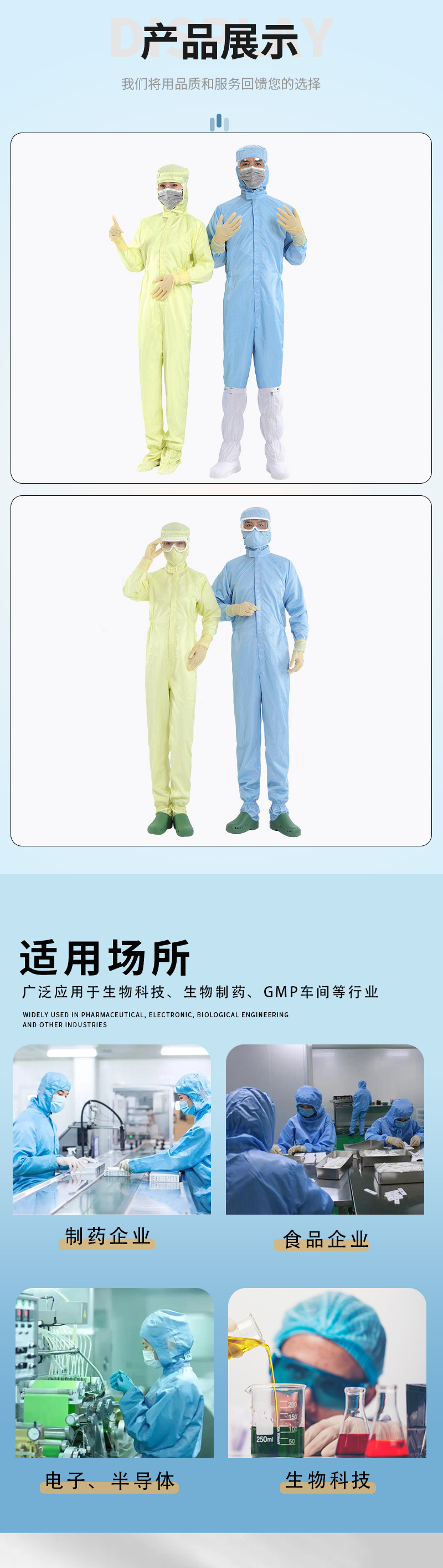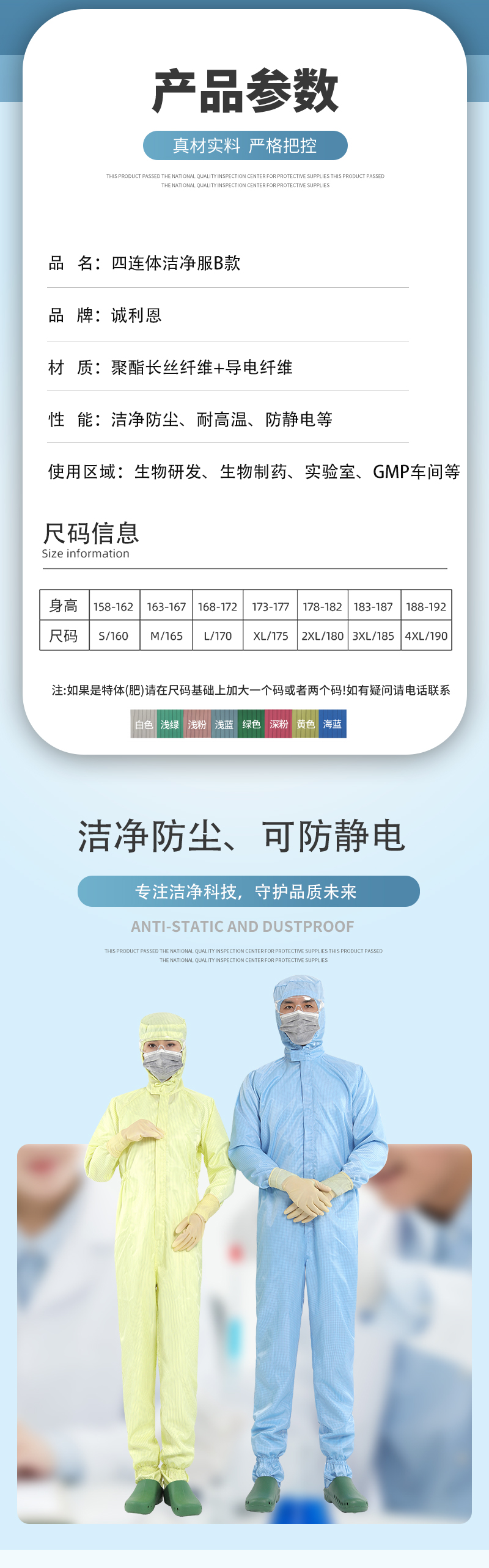 產(chǎn)品性能優(yōu)勢(shì):潔凈防塵、阻隔粉塵顆粒物、耐高壓濕熱滅菌、永久防靜電、立體剪裁、不起球、布面光潔