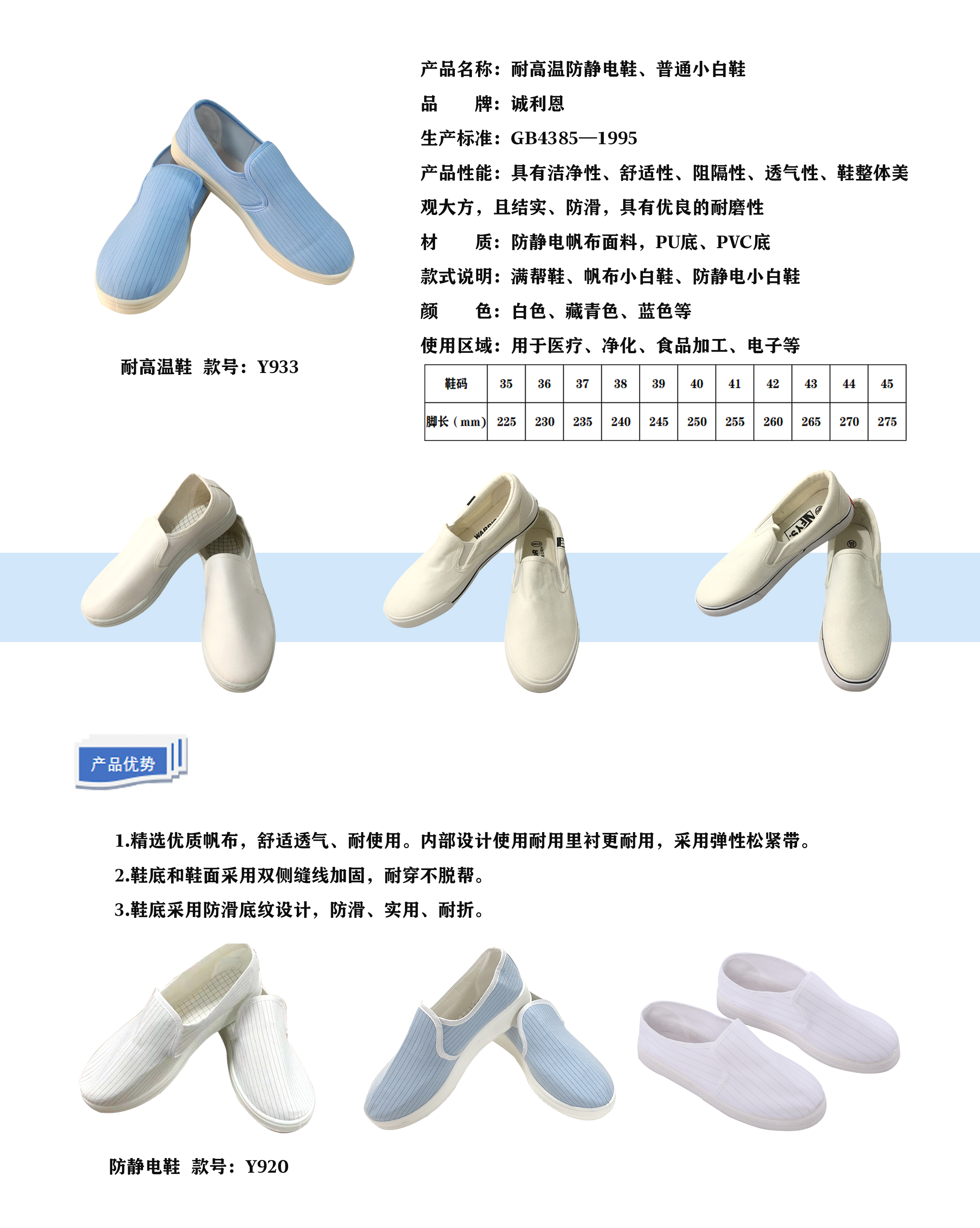 產(chǎn)品性能:具有潔凈性、舒適性、阻隔性、透氣性,鞋子整體美觀大方,結(jié)實防滑、耐磨損